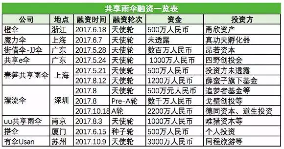 2017年10月,来自深圳的漂流伞获得了德同资本和道生资本领投的数千万元A轮融资。这是共享雨伞行业唯一一家走到了A轮的公司。