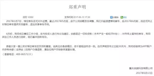 附上悟空单车官网贴出的正式宣告停止运营公告: