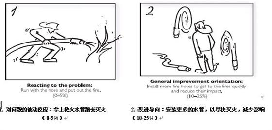 学习是卓越绩效中的关键理念,是一个高绩效组织的基本特征,也是用于评价组织过程成熟度的四个要素之一。有效且很好地展开的学习可以帮助组织:从“对问题的被动反应”的早期阶段(0-5%),改进到“全组织的完善和创新”阶段(70-100%)。以下图2是一组灭火的类比示意图,刻画了在“学习”这个评价要素上的成熟度水平进程: