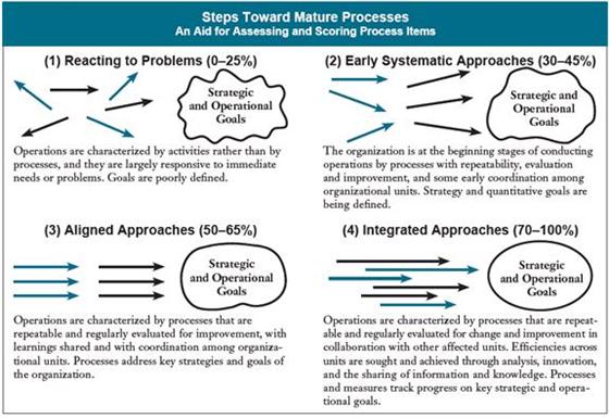 运行基于通过重复、定期评价而进行改进的过程,组织的单位间具有学习共享和协调。过程对应组织关键战略和组织目标。